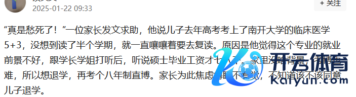 一位家长在会聚平台上发文求援,其字里行间充满了着急与无奈。他胪陈谈,女儿在客岁的高选取,凭借本人的不懈奋勉和出色推崇开云kaiyun,告成考上了南开大学的临床医学 5+3 专科。这本应是一件令东谈主无妄之福的大喜事,然则没猜度只是读了半个学期,女儿就运转连接地嚷嚷着要去复读。
