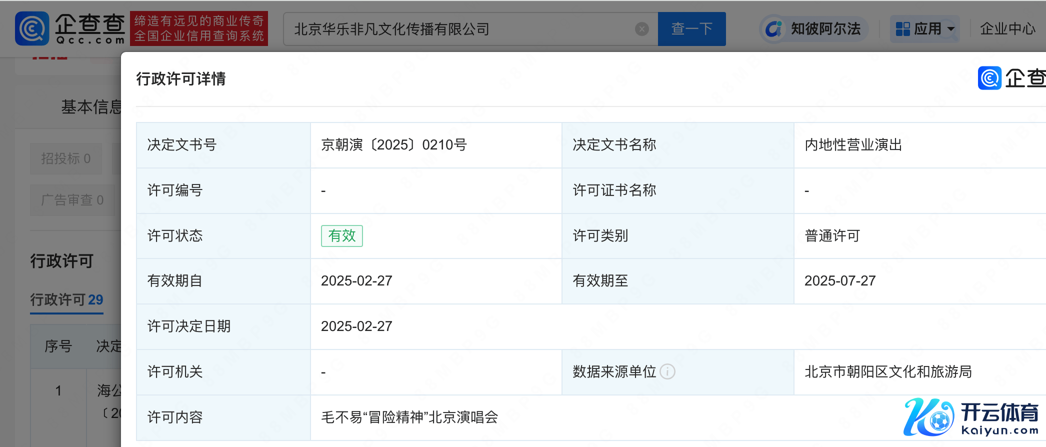 企查查APP贯通,近日,北京市向阳区文化和旅游局公示北京华乐不凡文化传播有限公司新增一条内地性商业上演许可,许可本体为毛不易“冒险精神”北京演唱会,灵验期自2025年2月27日至2025年7月27日。此前开云kaiyun,毛不易方已官宣将于西安、天津、哈尔滨三座城市巡演。