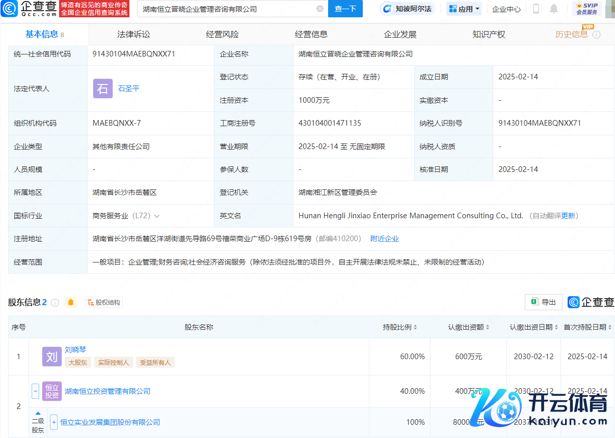企查查APP披露,近日,湖南恒立晋晓企业料理盘考有限公司缔造,法定代表东说念主为石圣平开云kaiyun官方网站,注册成本为1000万元,场地界限包含:企业料理;财务盘考;社会经济盘考处事。企查查股权穿透披露,该公司由刘晓琴、*ST恒立(000622)旗下湖南恒立投而已理有限公司共同抓股。